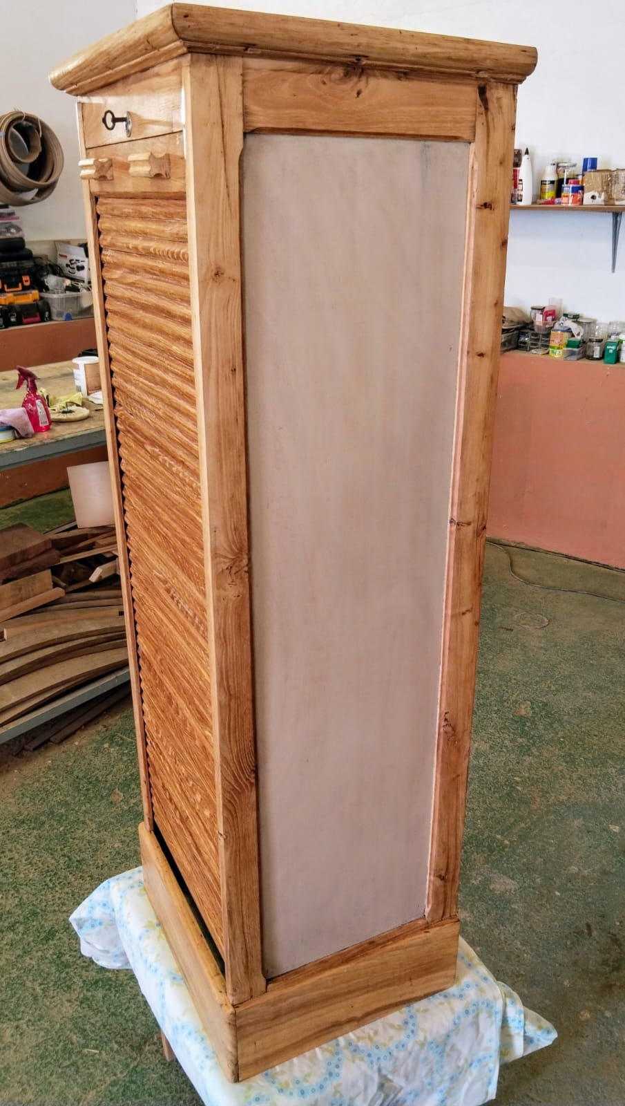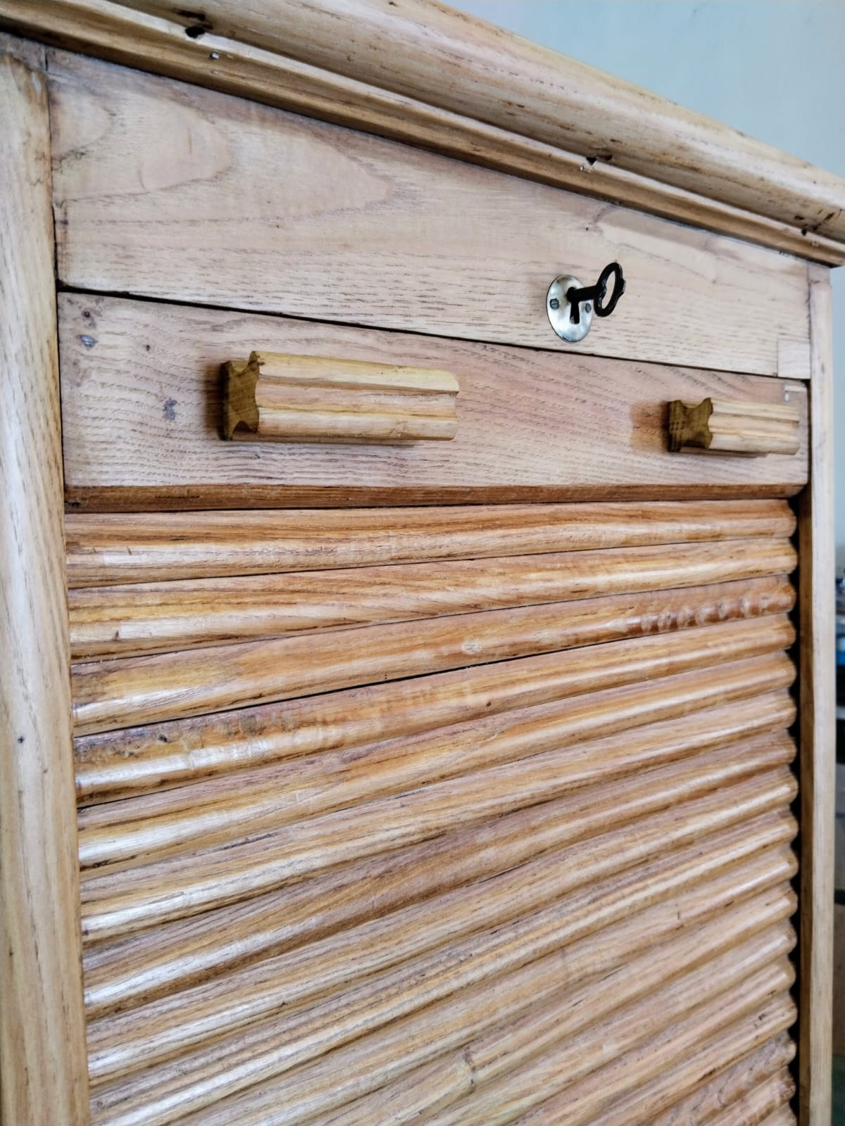 Elegancia Clásica, Aroma Fresco. Mueble restaurado de los años 50, en madera de castaño. Ideal como rincón de café. Sus estantes forrados y su persiana deslizante ocultan un espacio de ensueño para tus momentos de relax. Un toque de historia y funcionalidad para tu hogar.