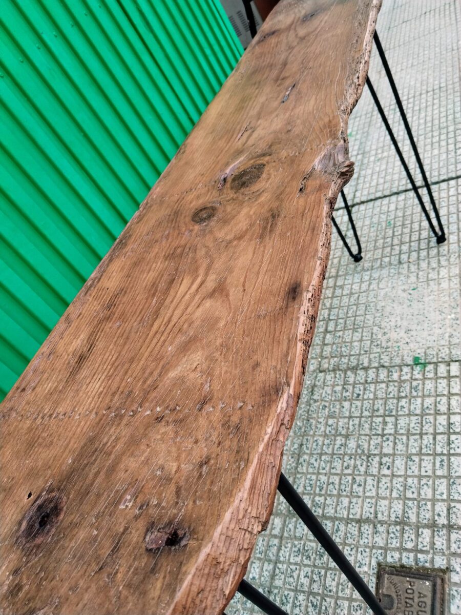 Cada paso de esta transformación ha sido ejecutado con maestría: la madera ha sido tratada con productos antixilófagos para garantizar su durabilidad, sellada para preservar su textura y terminada con una pátina que potencia su carácter único. Sus patas de hierro aportan una estructura robusta, creando un diálogo entre la calidez de la madera centenaria y la fuerza en sus patas