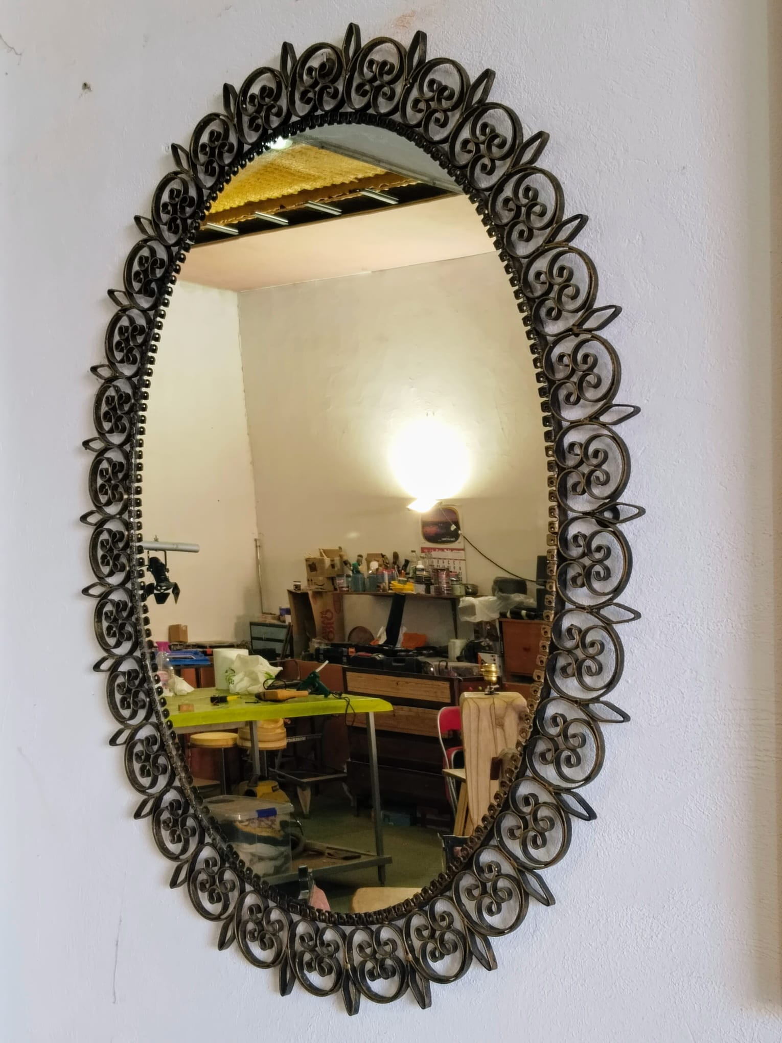 Espejo ovalado de hierro forjado, elaborado artesanalmente con un diseño único que combina elegancia y carácter. Sus dimensiones de 100 x 82 cm lo convierten en un auténtico tesoro decorativo, perfecto para añadir un toque cómodo a cualquier estancia.