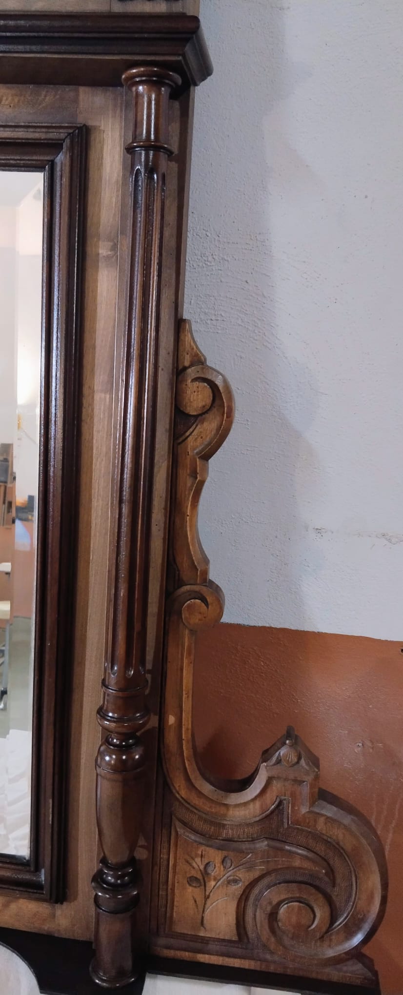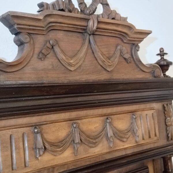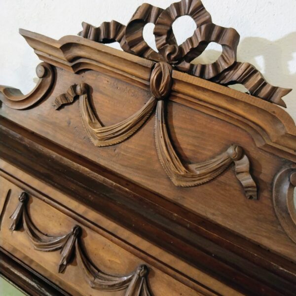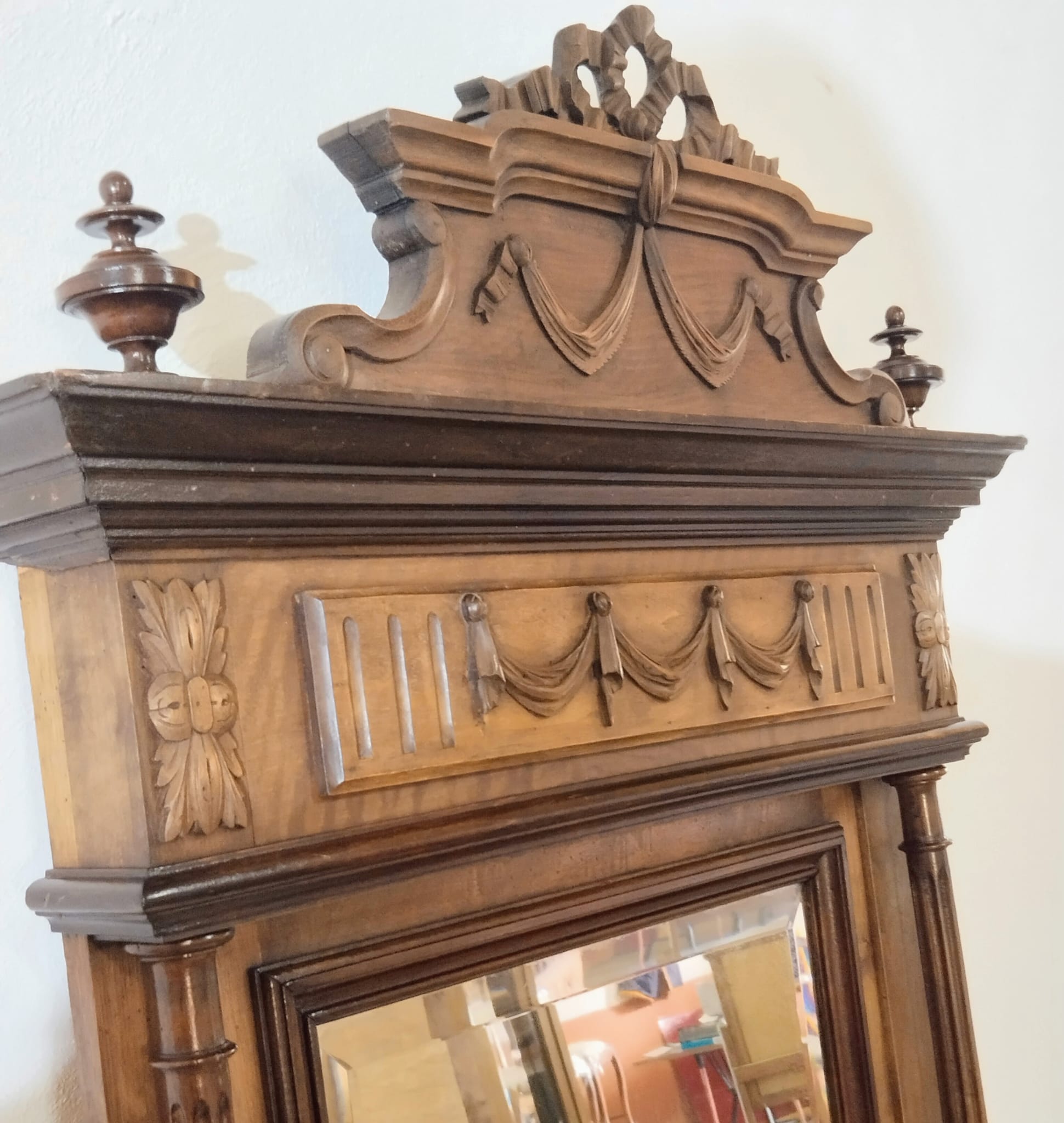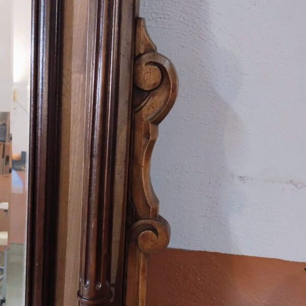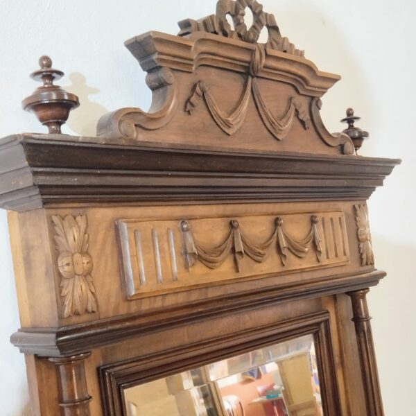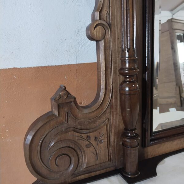 La composición presenta un frontón superior tallado con motivos de lazo y guirnaldas, rematado por copete calado, bajo el que se desarrolla un friso ornamentado con relieves de inspiración clásica. La estructura se organiza mediante columnas torneadas laterales que enmarcan el espejo central, aportando verticalidad y presencia. Los laterales inferiores muestran volutas talladas que equilibran visualmente el conjunto y refuerzan su carácter historicista.