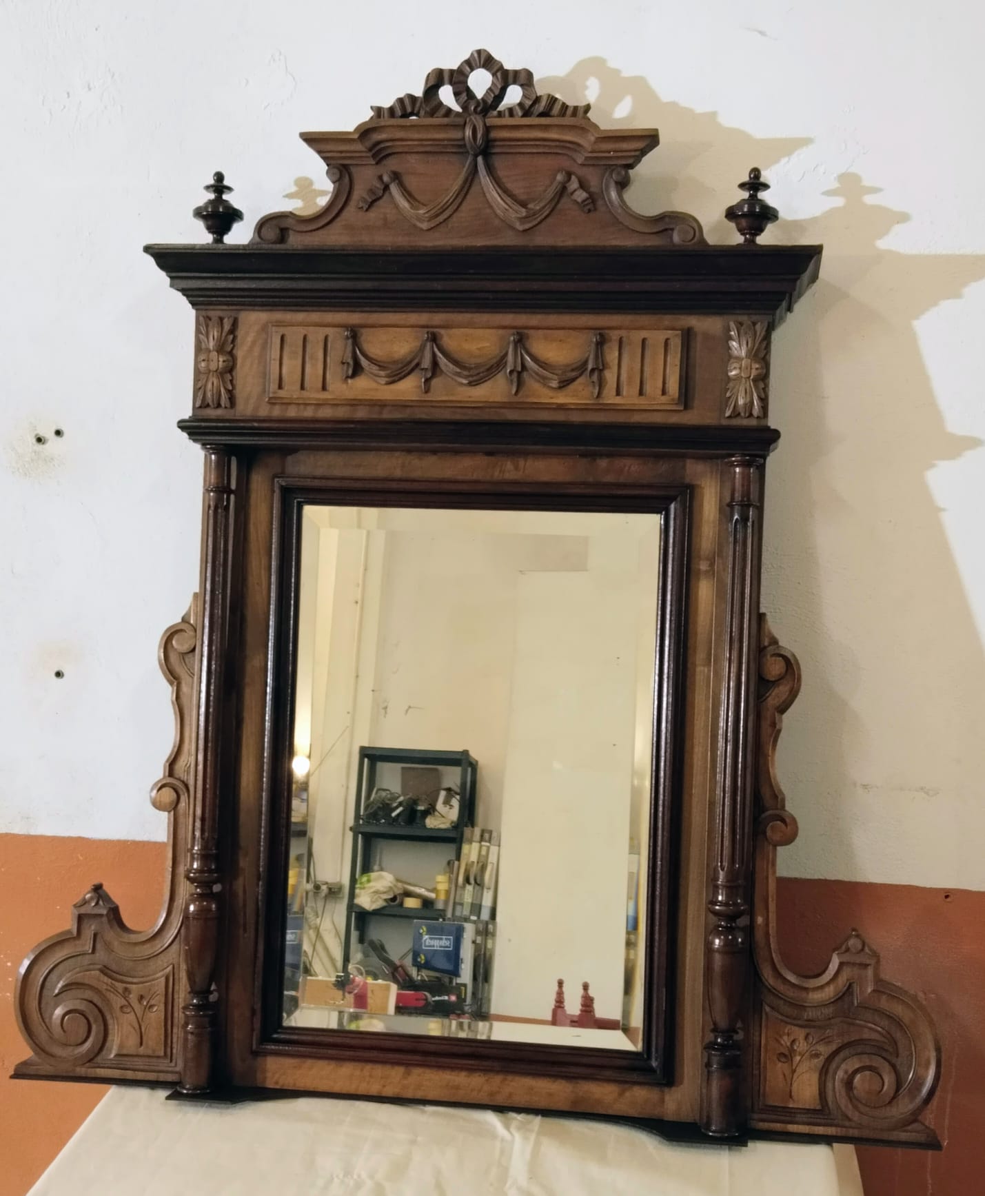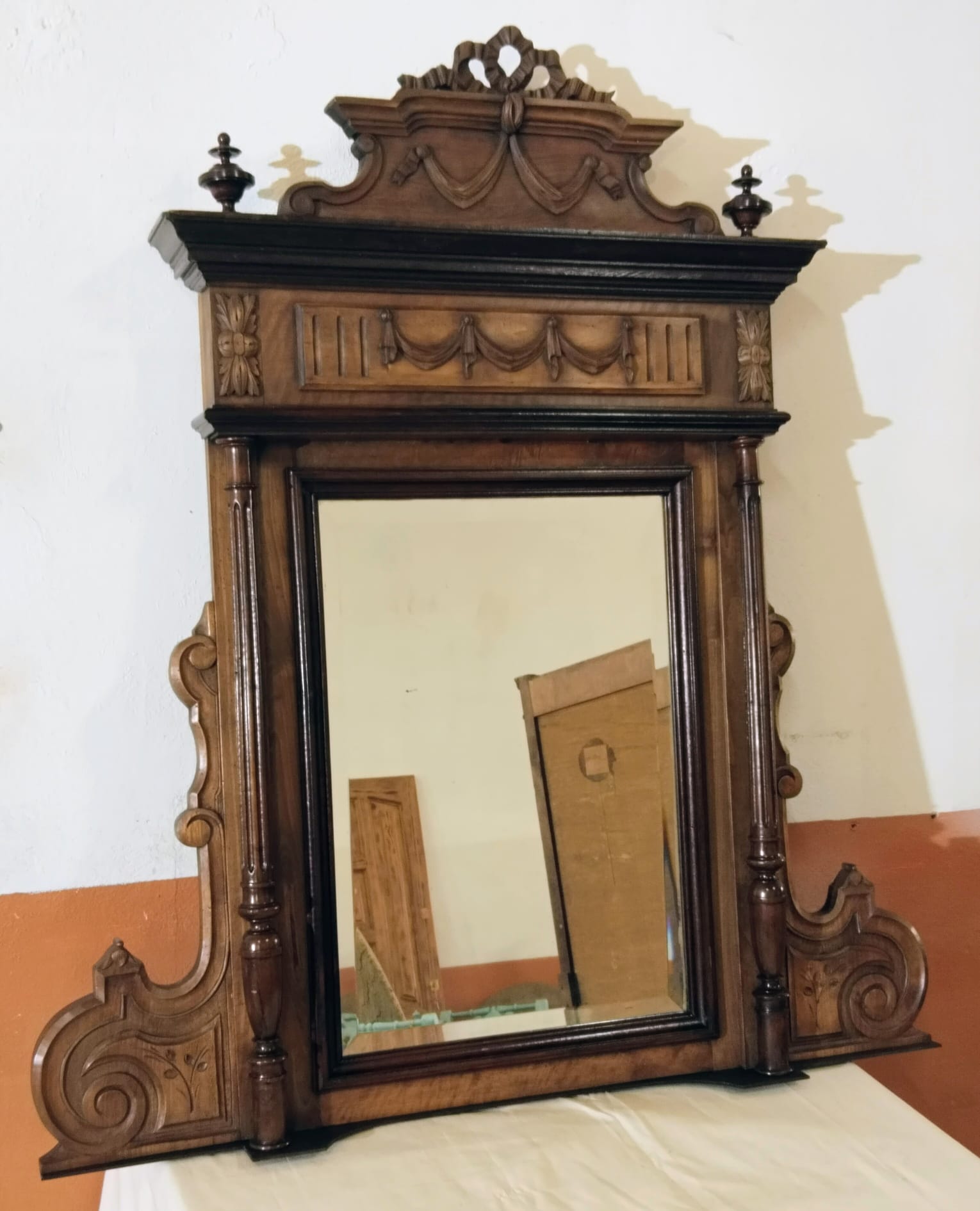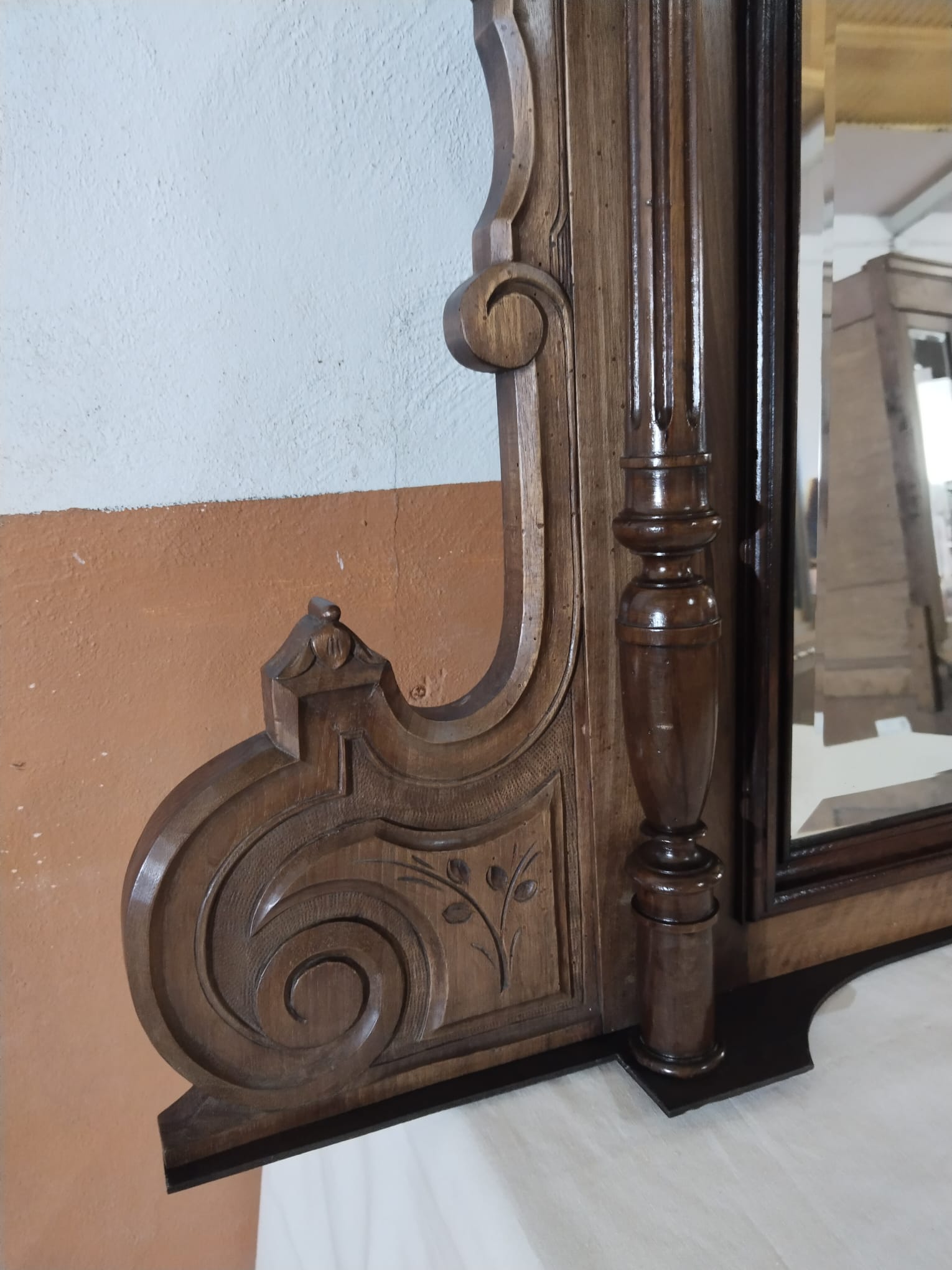 La composición presenta un frontón superior tallado con motivos de lazo y guirnaldas, rematado por copete calado, bajo el que se desarrolla un friso ornamentado con relieves de inspiración clásica. La estructura se organiza mediante columnas torneadas laterales que enmarcan el espejo central, aportando verticalidad y presencia. Los laterales inferiores muestran volutas talladas que equilibran visualmente el conjunto y refuerzan su carácter historicista.