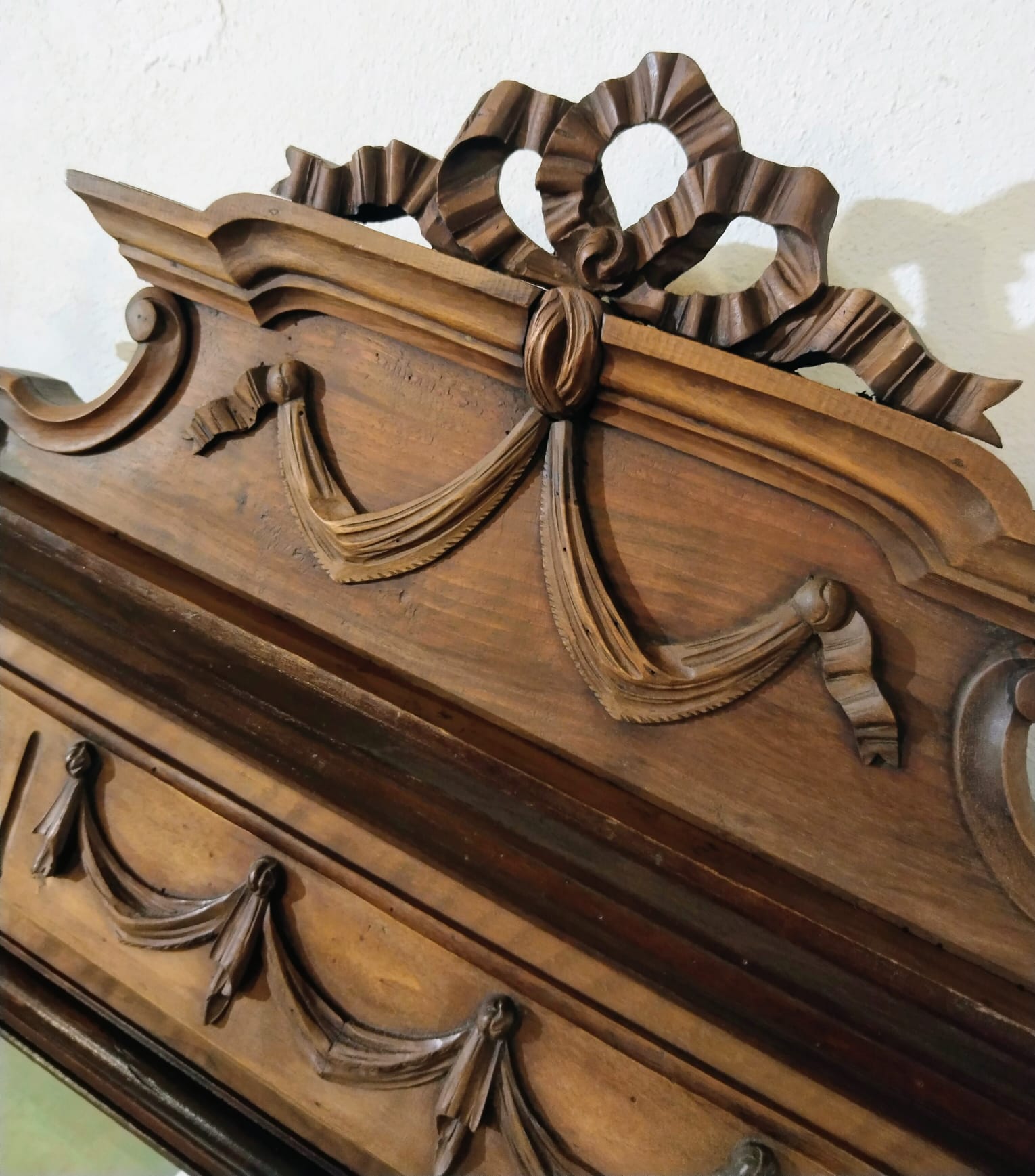 La madera, nogal macizo, ofrece una veta cálida y profunda que potencia la lectura volumétrica de la talla. El contraste entre molduras y planos lisos genera un juego de luces que realza el trabajo de ebanistería.
