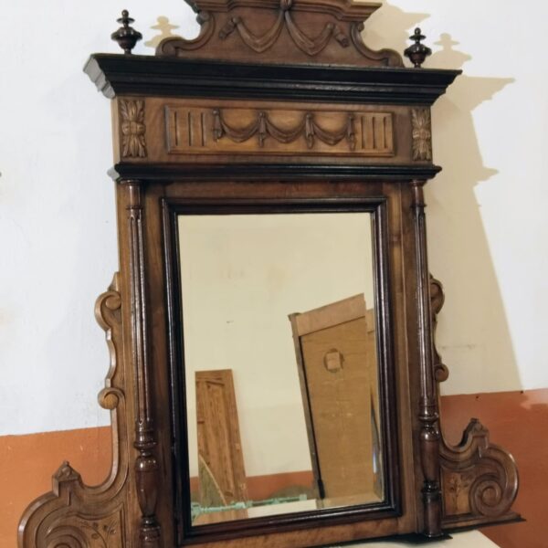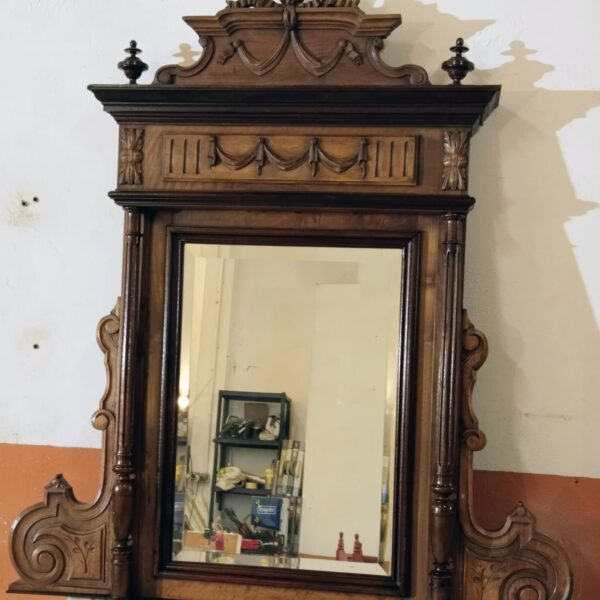 Espejo neorrenacentista francés realizado en nogal macizo, fechado a finales del siglo XIX. Se trata de una pieza de marcada arquitectura, concebida más como elemento estructural de salón que como simple objeto decorativo.