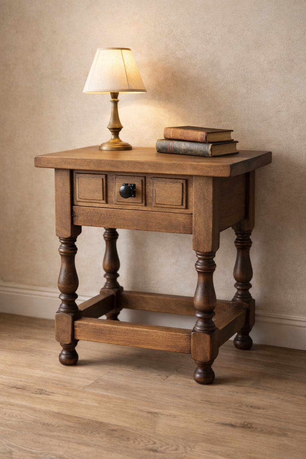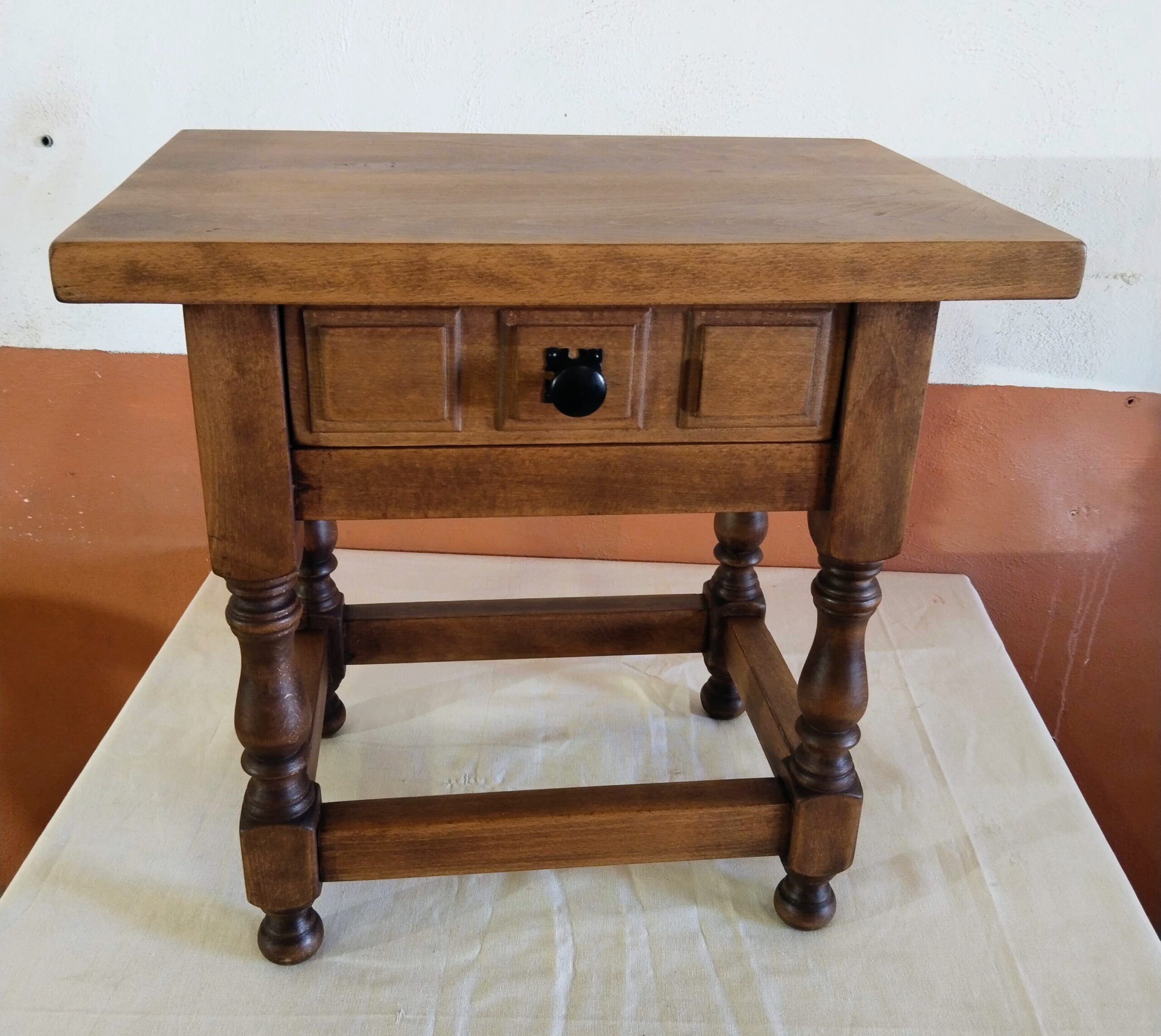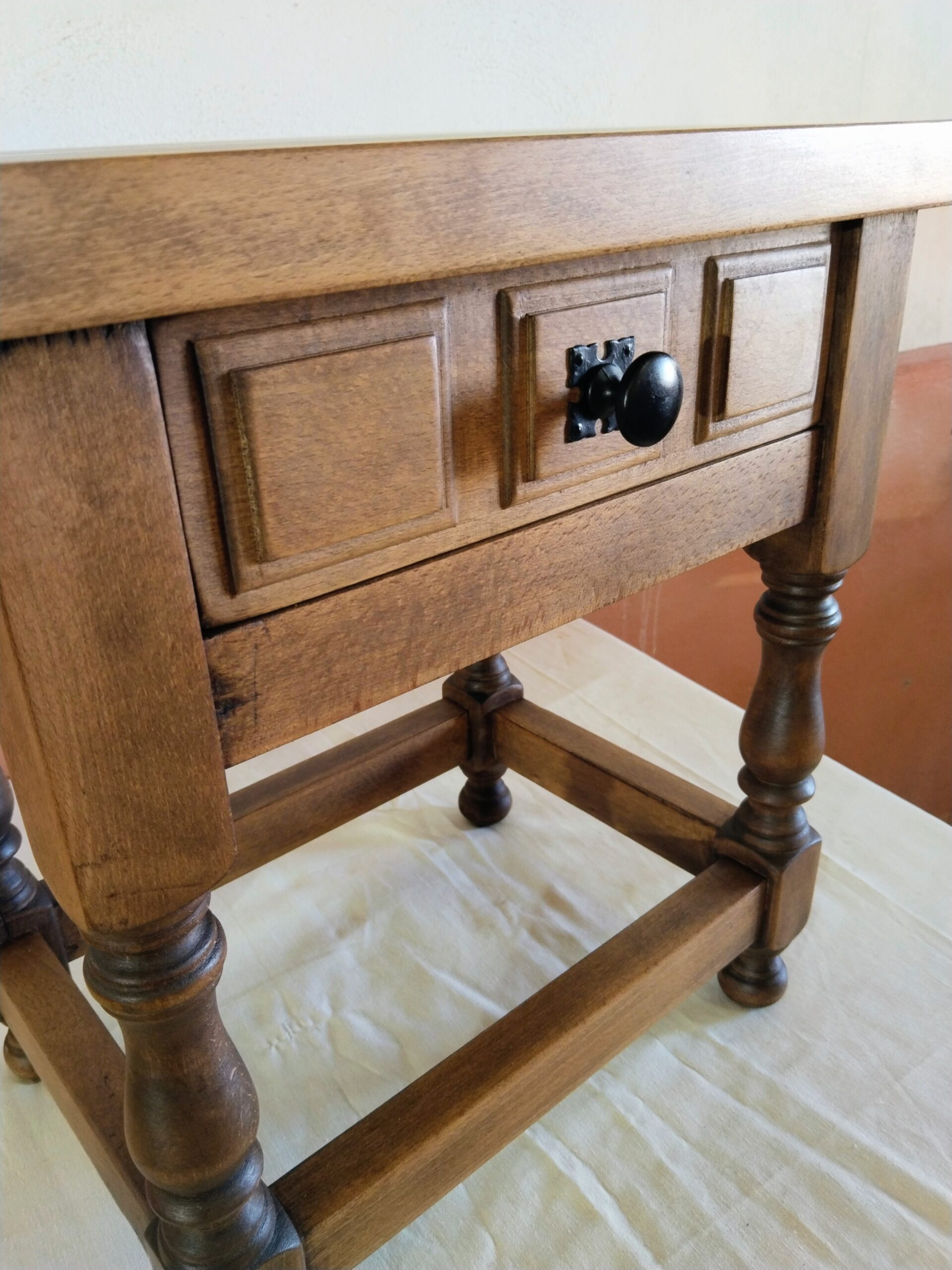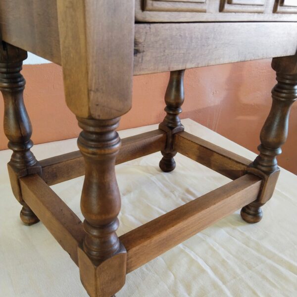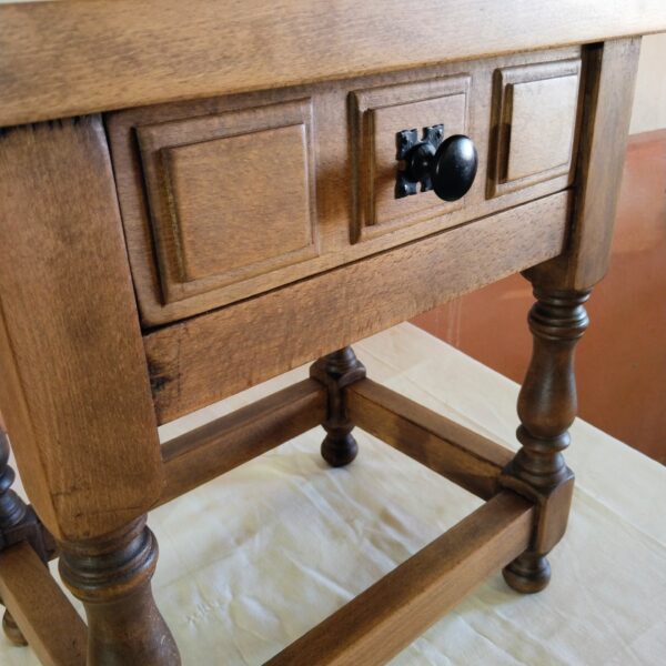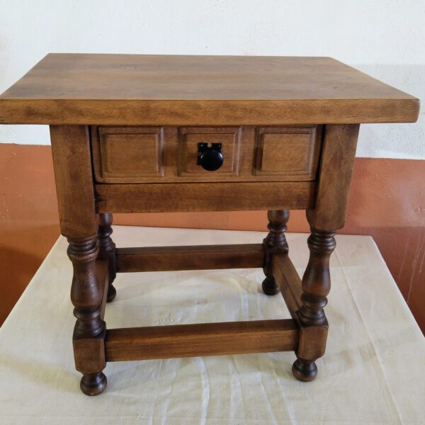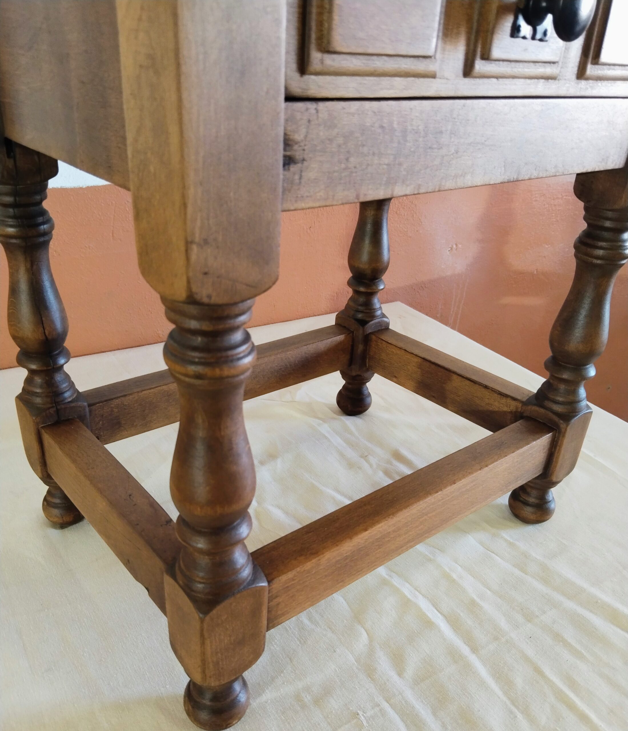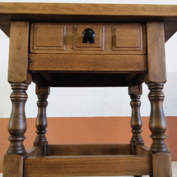 De proporciones equilibradas, presenta sobre macizo de una sola pieza con veta marcada, faldón liso y cajón frontal decorado con tres cuarterones moldurados. Las patas torneadas, unidas mediante chambranas perimetrales, aportan solidez estructural y estabilidad, reforzando su carácter funcional y atemporal.