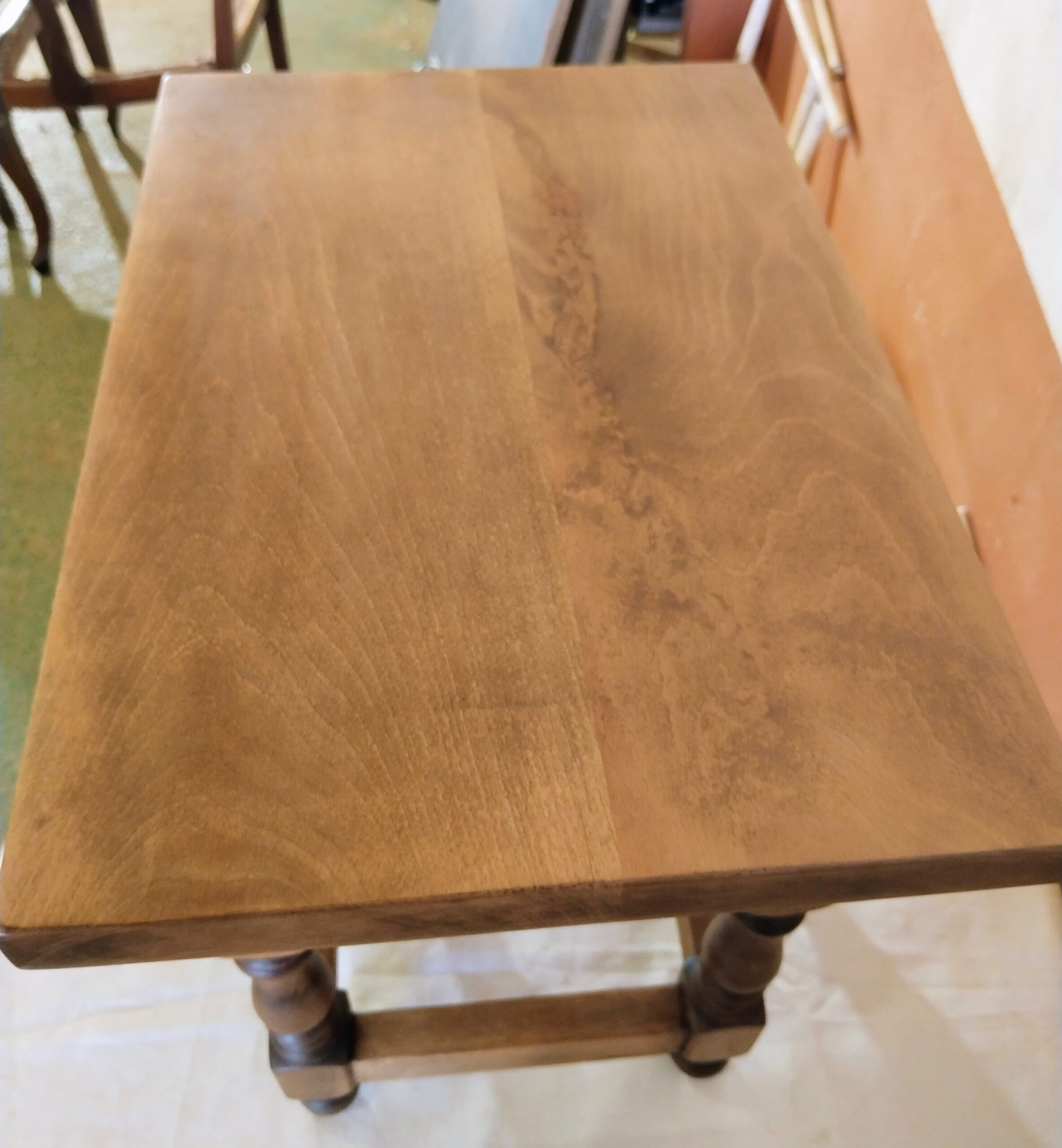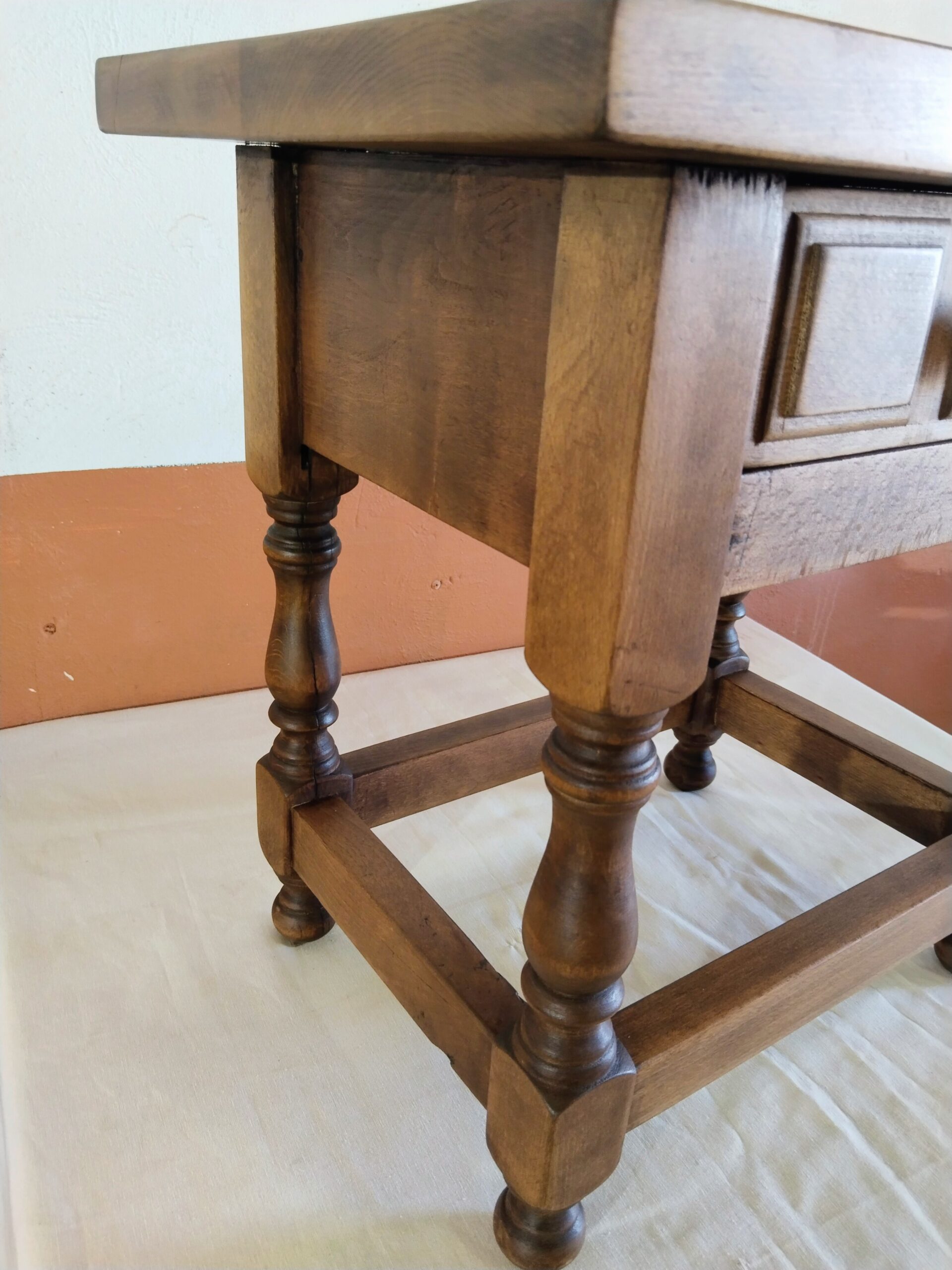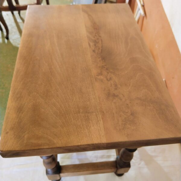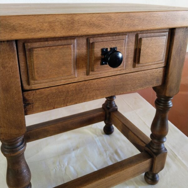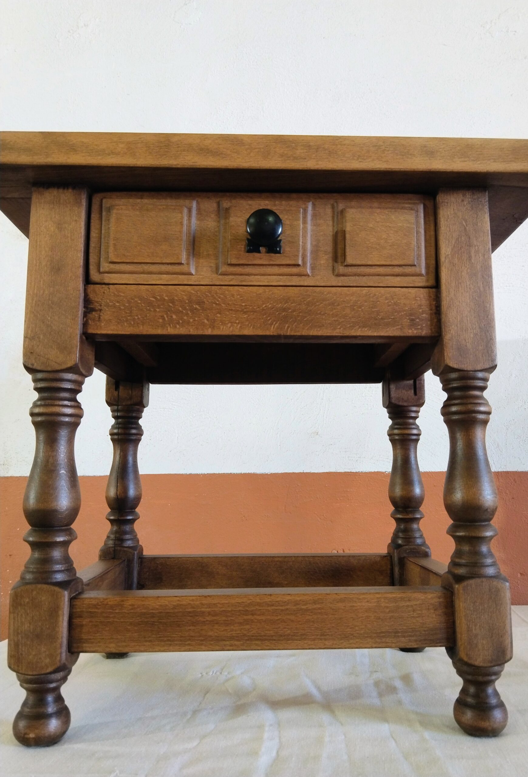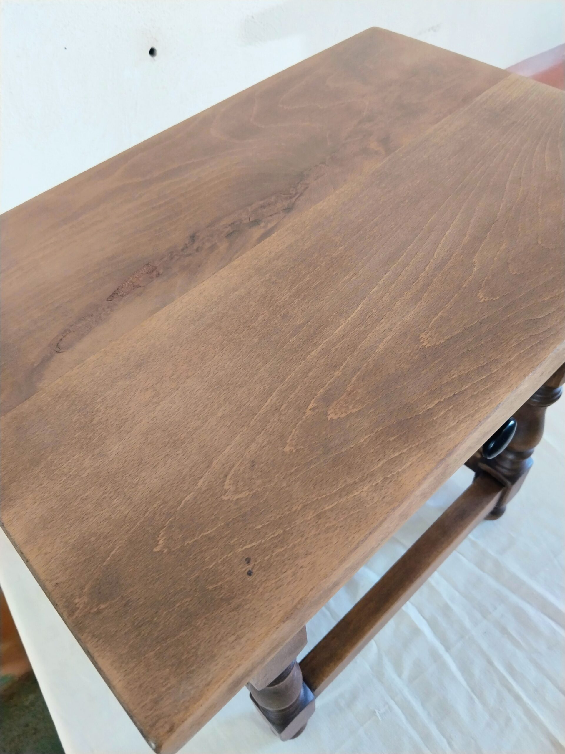 De proporciones equilibradas, presenta sobre macizo de una sola pieza con veta marcada, faldón liso y cajón frontal decorado con tres cuarterones moldurados. Las patas torneadas, unidas mediante chambranas perimetrales, aportan solidez estructural y estabilidad, reforzando su carácter funcional y atemporal.