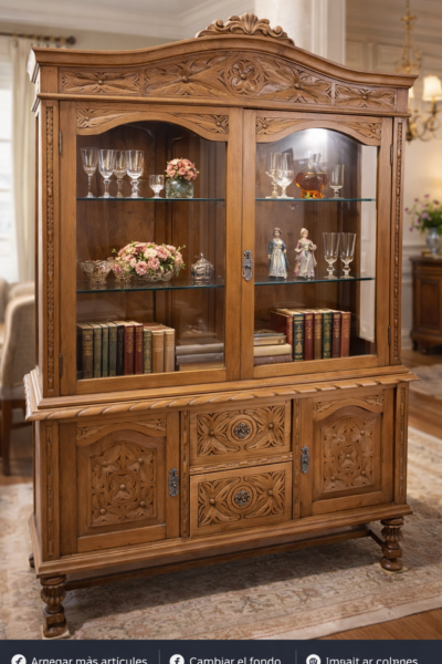 Mueble historicista con talla original y cristales biselados, intervenido mediante restauración conservativa y acabado tradicional a la cera. Roble macizo, estructura sólida y carácter auténtico.